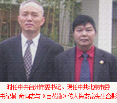 《百花散》傳人梅先生與中共臺州市委書記陳奕君同志合影紀念2018年7月《百花散》傳人梅先生與中共臺州市委書記陳奕君同志合影紀念2018年7月      天臺山古代中醫(yī)食療植物方梅氏《百花散》開發(fā)十年以來,已經使各類胃腸疾病患者及肝硬化腹水病人數萬人(包括胃病變、腸病變、食道病變、肝病變患者)恢復健康,得到廣大患者一致好評,并在康復患者中發(fā)展了數百名愛心使者擔任各地代理,為病痛患者服務引起社會強烈反響。古代傳世植物食療方《百花散》系列產品對胃病變、腸病變、食道病變、肝病變有神奇康復效果,已使眾多的重癥患者得到有效食療并康復。這一消息不脛而走,引起了河南省抗癌協會、河南省保健品協會、鄭州市腫瘤康復協會相關專家教授的高度重視,被禪醫(yī)武著稱的少林寺藥局局長釋延琳大法師和中國道教協會副會長、江西龍虎山天師府張金濤天師稱為中華民族之瑰寶,并得到社會各界人士和媒體關注。